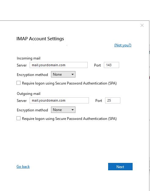 2. In the account settings, enter the server address mail.yourdomain.com for IMAP or mail.yourdomain.com
